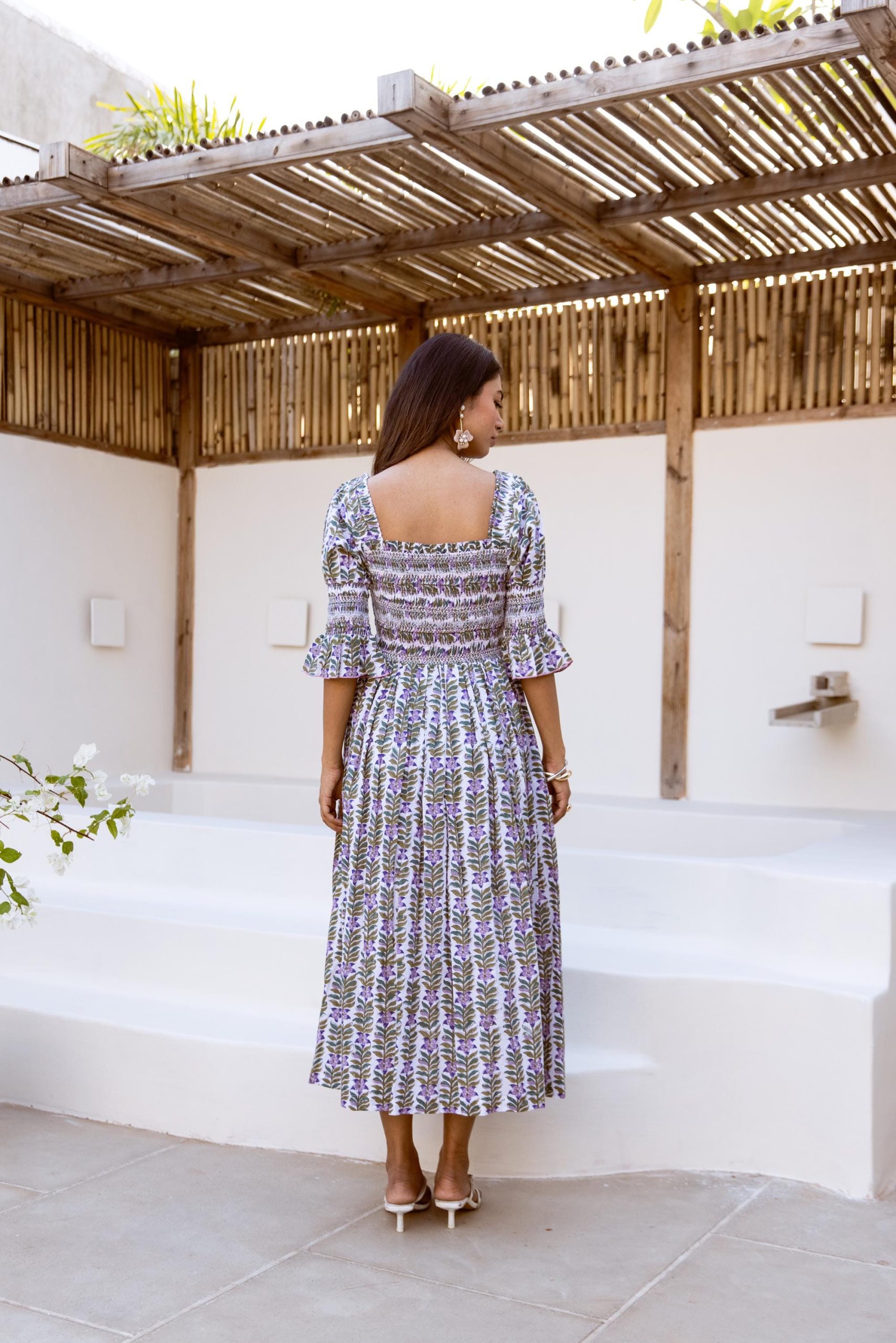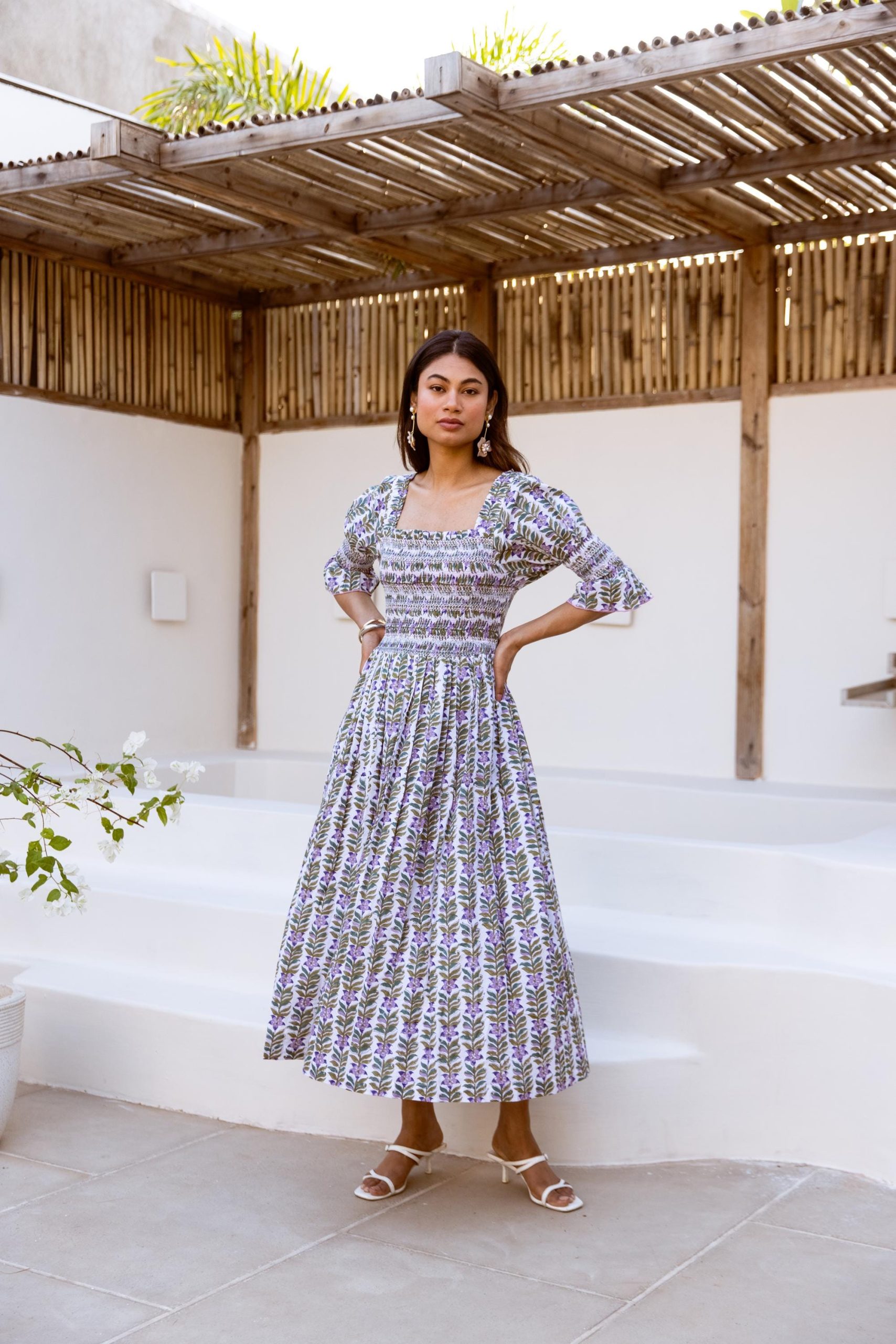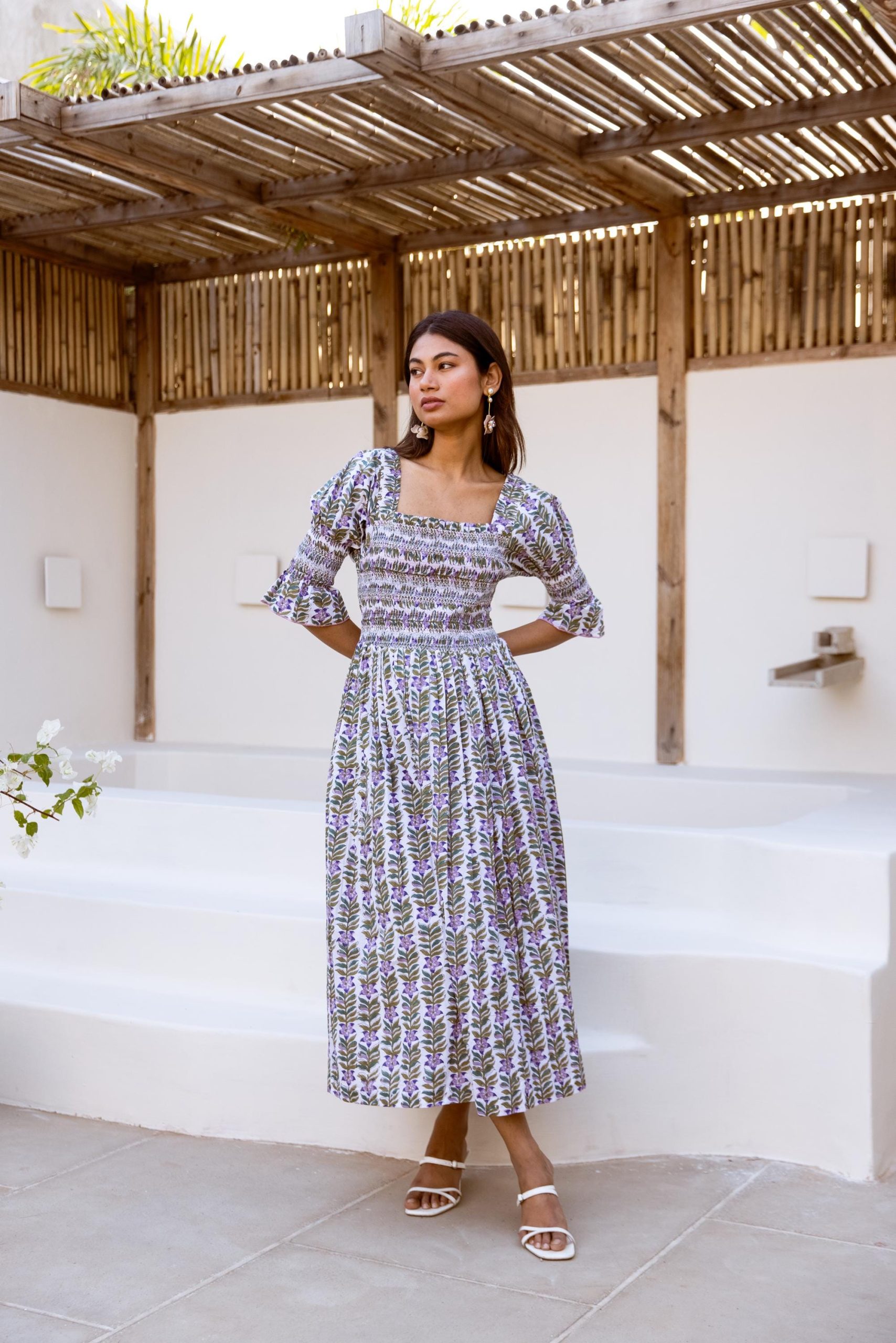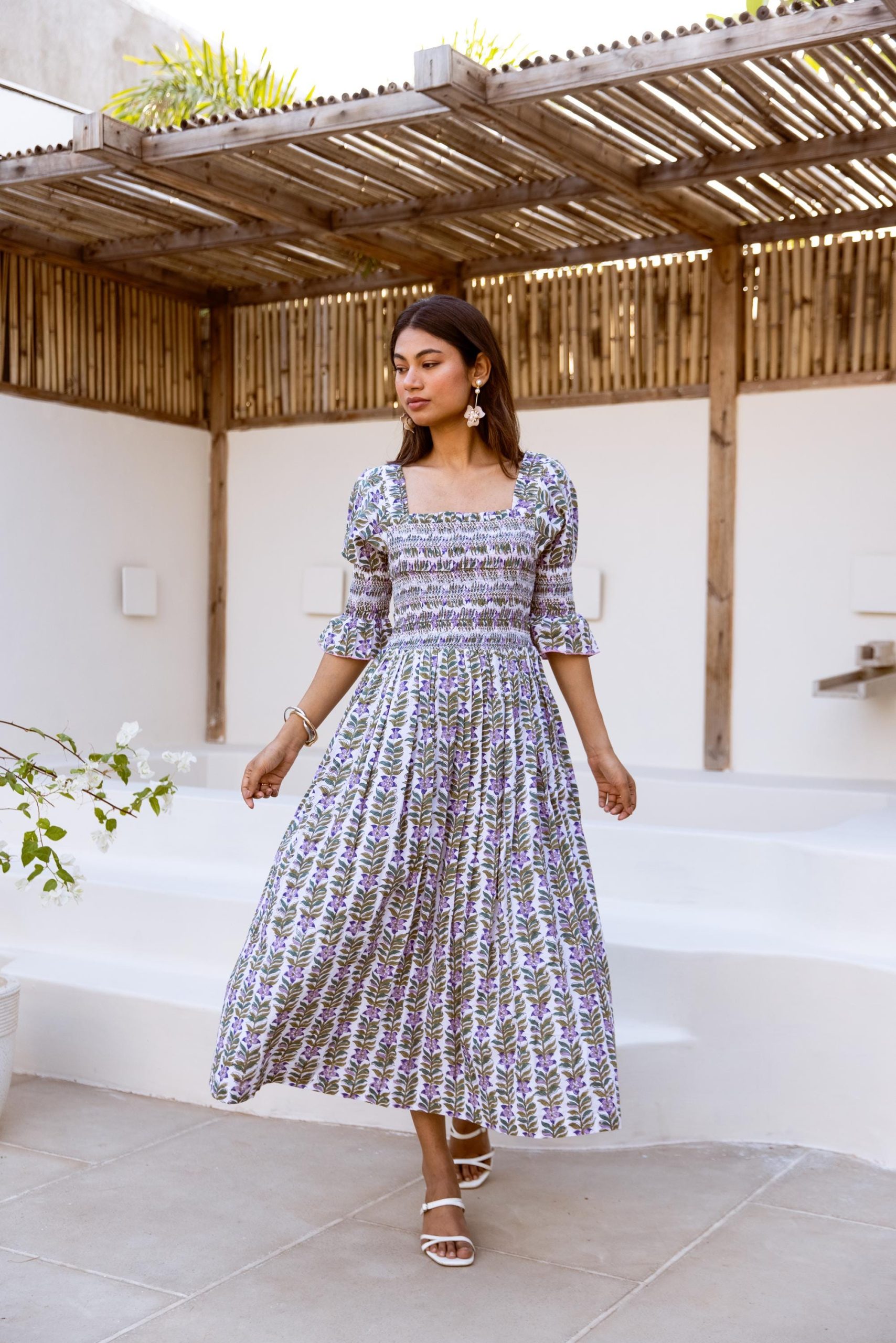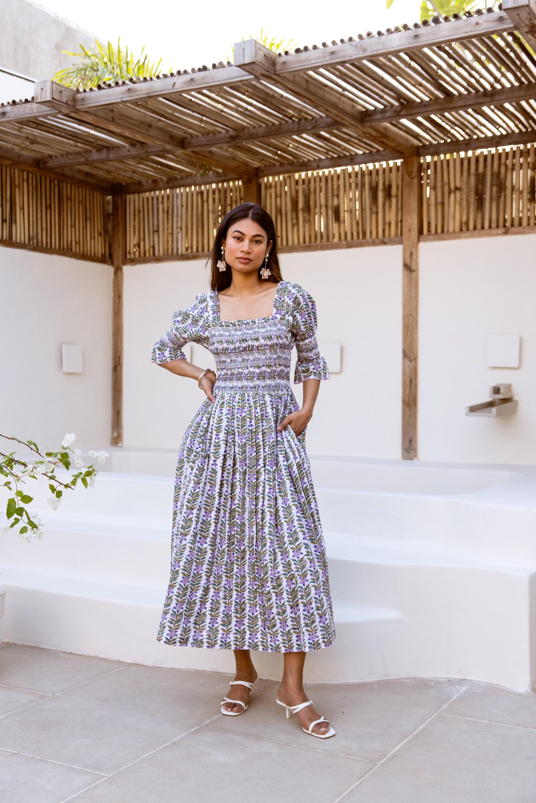 Crafted from breathable cotton and hand block-printed in vibrant, feel-good colors, this one’s made to brighten your day. The body features colorful smocking that hugs just right, while puff sleeves with matching smocked details add a fun, flirty touch. A square neckline keeps it sweet and structured, and yes—it has pockets.